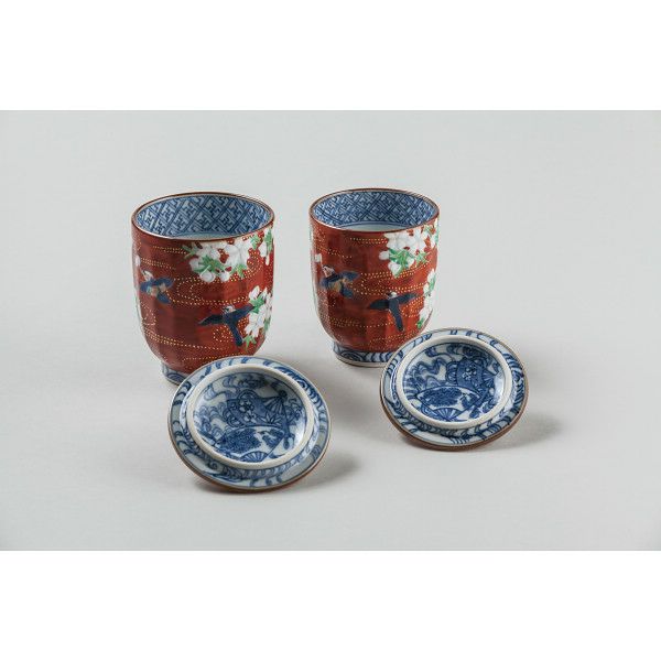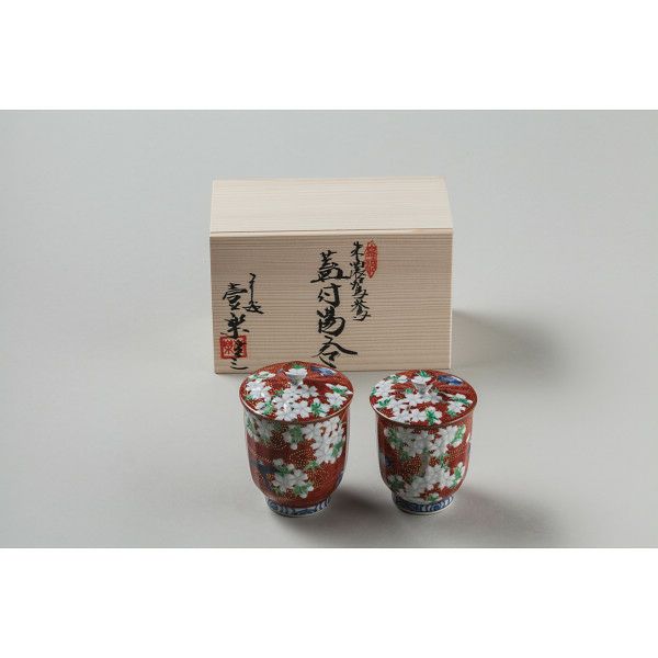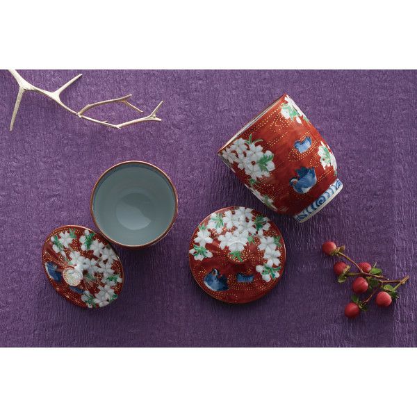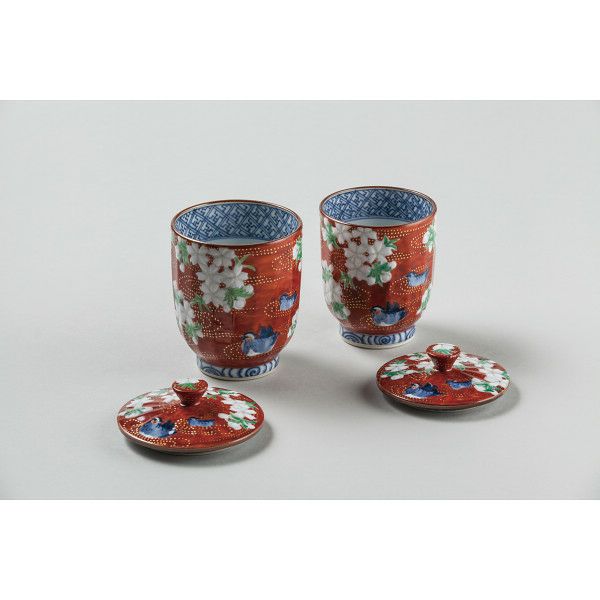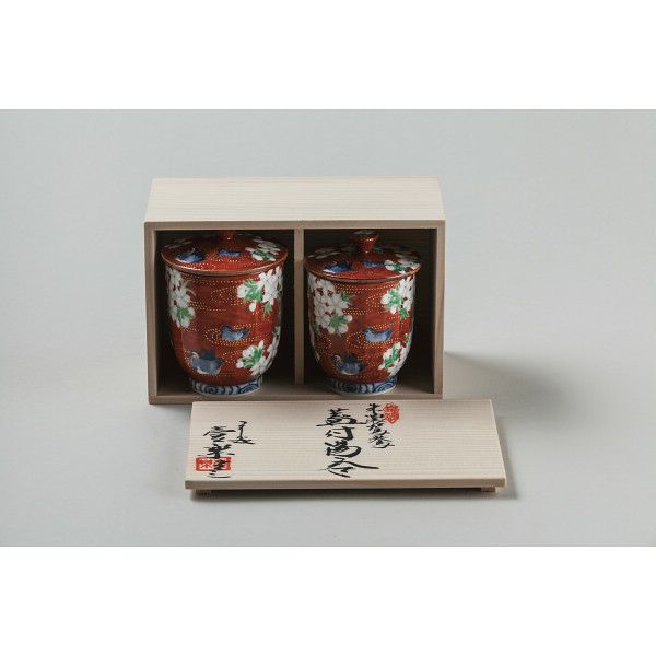 清水焼 朱濃鴛鴦 蓋付組湯呑